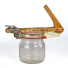 Jar openers that are designed to wedge open a lid sealed by a rubber ring were patented and produced in Germany in the mid 1930s, but all production has halted following the turn of the century. On the right is an example of a wooden vintage jar opener for preserve jars.