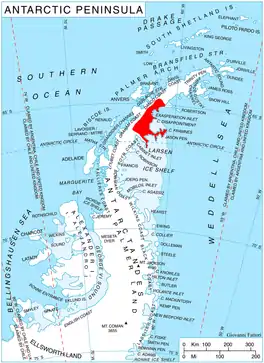 Jason Peninsula (66°10′S 61°0′W) is a large peninsula on the east coast of Graham Land comprising several mainly snow-covered summits. It rises above the Larsen Ice Shelf and extends from the narrow neck of land east of Medea Dome for 42 nautical miles (78 km), terminating in Cape Framnes. This feature was first seen from seaward on December 1, 1893, by Carl Anton Larsen, who named one of the high peaks "Mount Jason" after his ship, the Jason. Larsen was too distant to map the area in detail, but in 1902 the Swedish Antarctic Expedition under Otto Nordenskiöld observed the area from Borchgrevink Nunatak and reported the peaks seen by Larsen to be separated from the mainland. The name "Jason Island" was subsequently used for Larsen's discovery, but in 1955 the Falkland Islands Dependencies Survey determined this feature to be a large peninsula.[1]
