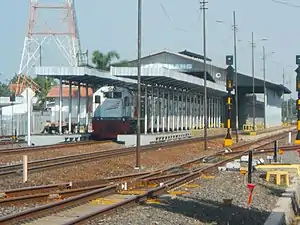 Jatibarang Station has five railway lines. Initially, line 2 was a straight line,[5] but since the construction of the Telagasari–Cirebon double-track line in 2004–2007,[6] the existing line 2 is only used as a straight line towards Cirebon, while line 3 is used as a straight line towards Cikampek. The station building which is a legacy of the Staatsspoorwegen is maintained. In the past, there was an rail siding leading to the Sriwidjaja Fertilizer Warehouse.[5]