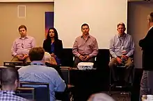 A JCP representative (far right) speaks to the trade press during a panel discussion at the JavaOne conference in 2012
