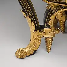 Boulle delivered the prototypes for the Mazarin Commode to the Grand Trianon in 1708. Louis Antoine de Pardaillan de Gondrin Director of the King's buildings, wrote to Louis XIV: "I was at the Trianon inspecting the second writing desk by Boulle; it is as beautiful as the other and suits the room perfectly."[43] The design proved to be popular, although criticized for being awkward meaning, particularly because four extra spiral legs that were required to support the weight of the bronze and marble. At least five other examples were made by Boulle's workshop, dated between 1710 and 1732, including one now in the Metropolitan Museum of Art.[43]