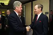 Chrétien promised to renegotiate the North American Free Trade Agreement (NAFTA), and reform to the unemployment insurance system. The Liberals were in favour of a free trade agreement for North America in principle, but went on to accuse Mulroney of having given away too much to the Americans and Mexicans when he signed NAFTA in 1992, and stated that the Liberal government would renegotiate NAFTA on more favourable terms to Canada within six months of taking office. Failing that, Chrétien promised that Canada would renounce NAFTA. The main emphasis was on a promise to spend $6 billion on improving infrastructure in a Keynesian move to fight the recession of the early 1990s.[105] As regarding the debt situation, Chrétien promised to reduce Canada's deficit to 3 per cent of GDP (the same deficit to GDP ratio required to enter the European Union) within three years of taking office.[106] Chrétien made it clear that the 3 percent deficit to GDP ratio would apply only to the federal government, whereas the Maastricht Treaty of 1991 which set out the 3 percent deficit to GDP ratio in order to enter the European Union stated that this applied to all levels of government.[106] The Liberal government promised to achieve its goal of reducing the deficit to 3 percent of the GDP by cancelling the contract to replace the Sea King helicopters, privatizing Toronto Pearson Airport, and by eliminating unspecified "waste" in the government. After the 3 percent target had been achieved within the first three years of taking office, Chrétien promised the deficit would be eliminated at some unspecified time in the future. Martin wanted to promise to eliminate the deficit altogether, but had been overruled by Chrétien, who had wanted to present the Liberals as the "caring" party that would defend social programs, unlike the "heartless" Conservatives and the Reform Party who Chrétien claimed wanted to eliminate the deficit within two or three years by gutting social programs with no thought for any suffering that this might cause.[107] Chrétien claimed in his campaign speeches that Reform's plans for eliminating the deficit within two or three years of taking office would cause at least a 25 percent unemployment rate, if not higher, which Chrétien claimed starkly in a series of speeches would cause a bloody "revolution".[108] Chrétien had personally chosen the target of reducing the deficit to 3 percent of GDP as it made the Liberals seemed fiscally responsible while at the same time promised that the Liberals would not inflict too much economic pain to achieve that fiscal responsibility.[106] One Liberal candidate Herb Dhaliwal recalled that for Chrétien at time of the 1993 election that the national deficit was not a major issue and that: "His attitude was that the deficit is ok as long as you can manage it".[108]