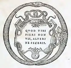 The emblem of the de Tournes press was two entwined vipers. Their mottoes included Nescit labi virtus; Son art en Dieu; Per ipsum facta sunt omnia; Quod tibi fieri non vis, alteri ne feceris and Virum de mille unum reperi.[1]