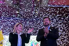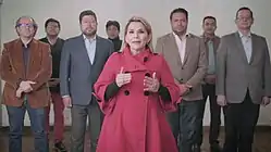 Having secured the presidency, Áñez, together with other opposition legislators and civic leaders, including Camacho and Marco Pumari, made their way to the Palacio Quemado, the president's former residence prior to the construction of the Casa Grande del Pueblo in 2018.[59] Greeting a crowd of supporters, Áñez emerged onto the balcony dressed in the traditional presidential regalia, including the sash and historic presidential medal. Flanked by her two children on either side, as well as senators and civic leaders, she delivered a short speech pledging to "restore democracy to the country": "I am going to work this short time because Bolivians deserve to live in freedom, they deserve to live in democracy, and never again will their vote be stolen", she said.[60][61] Notably, Áñez, a Catholic, also brandished a small pink Bible, declaring that "God has allowed the Bible to enter the Palace again". Before Morales' presidency, and until 2009, Bolivia was not a secular state, and the former president's relationship with the Church was controversial.[62][63] At age fifty-two, Áñez was Bolivia's sixty-sixth president and is the second woman to have ever held the post, after Lidia Gueiler, who herself was a transitional president between 1979 and 1980.[64]