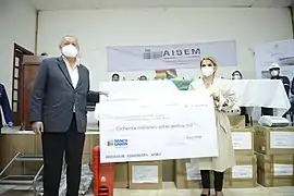 Áñez's arrival to office was met with praise by Bolivian opposition and civic leaders. The first to congratulate her was former president Carlos Mesa—runner-up in the disputed presidential election—who wished Áñez success in carrying out the transition process.[69] Among members of her party, Governor Rubén Costas conveyed his hope that Áñez find "success in her crucial mission of leading the nation" while Senator Óscar Ortiz stated: "God bless and enlighten the new president of Bolivia". Former vice president Víctor Hugo Cárdenas expressed his hope that the new president "never forget the indigenous peoples, the Wiphala, the youth, and women" while politician and pastor Chi Hyun Chung asked that "God give her wisdom and strength".[70]
