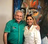 During her first term, Áñez became affiliated with the political project of Santa Cruz Governor Rubén Costas. When Costas' civic group Truth and Social Democracy (Verdes) established itself as a regional political party in 2011, she attended its departmental congress as a representative for Governor Ernesto Suárez and Santa Cruz Mayor Percy Fernández.[31] In December 2013, she attended the first founding congress of the Social Democratic Movement (DEMÓCRATAS; MDS).[32] By early 2014, with the disintegration of CN as a viable political force and the dispersion of its members to other fronts, Áñez was already noted as one of the at least twenty assembly members who had joined the Democrats.[33] As part of the negotiations between the Democrats and the National Unity Front (UN) to form the Democratic Unity (UD) coalition, it was agreed that each party would define its own electoral lists in the departments in which they were most present. As a result, the MDS was allowed to designate candidates in Beni and Santa Cruz and, on 27 June 2014, Áñez—now the party's spokeswoman—announced that it had nominated her to go to reelection as its candidate for senator for Beni.[34][35]