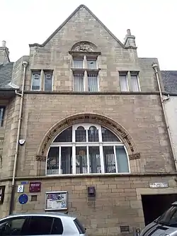 On 4 October 1894 Andrew Carnegie in Jedburgh gave a speech about the new library which he had funded in the town's High Street.[6] This library however proved inadequate and a new library was constructed on Castlegate where the Nag's Head Inn had stood. The new "Carnegie Library" was fronted by the town's arms and above the porch was the message "Let There be Light". The building was designed by Sir George Washington Browne and it formally opened on 24 May 1900 with Andrew Carnegie once more in attendance. It was designed to hold 12,000 books and 59 readers and rooms were set aside above for meetings and a museum. The building in now listed at Category B.[7]