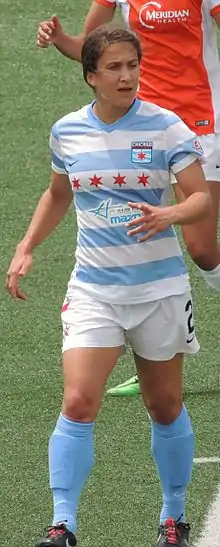Hoy was selected during the fourth round (25th overall) of the 2013 NWSL College Draft by the Chicago Red Stars for the inaugural season of the National Women's Soccer League.[3] She scored her first goal for the Red Stars in a match against the Seattle Reign FC on July 25, 2013.[4][5] On August 18, 2013, Jen Hoy scored 2 goals in a come from behind 2–1 upset win over FC Kansas City; and was named NWSL Week 19 Player of the Week,[6] and finished her rookie season with 3 goals and 1 assist in only 481 minutes in nine games.