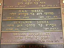 - On the plaques above see the name Max Siegel, Siegel's father, whose Hebrew name is "Mordechai Dov ben Reb Beirush HaLevi" (from the Hebraic tribe of the Levites) and the one for Siegel, whose Hebrew name is "Bairush HaLevi ben Reb Mordechai Dov HaLevi;" from this we see that Bugsy was named for his grandfather, Dov, meaning bear (Bairush is the Yiddish for Dov), which was Americanized to Benjamin. All fathers are called Reb as an honorific on memorial plaques; Reb means "teacher" as in Rabbi.