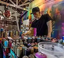 The period of record sleeves and skate posters ran parallel to commissions for a number of film posters.[8] Working for most of the major studios, Jim completed art for Lumiere, 20th Century Oz, I Never Promised You a Rose Garden, Kentucky Fried Movie, Big Wednesday, Herowork, Acapulco Gold, The Space Movie, Patrick, Neil Young's Rust Never Sleeps (for which Jim also animated the opening title sequence), and John Carpenter's first film Dark Star. Numerous books began to appear at this time and his work is included in the History of Rock Art, Phonographics, Roger Dean's Album Art Book, and The History of Underground Comics.[9] An interest in film led to work as an Art Director, set decorator, and storyboard artist for films. Evans worked on Killer's Kiss and Growing Pains. He also helped to prepare an American release for a series of Japanese films called The Baby Cart Series. Working with director Robert Houston and his partner David Weisman, Jim created the poster and title treatment for the 1980 release titled Shogun Assassin, Jim's son Gibran Evans voiced the narrative as Daigoro. An ongoing creative collaboration with John Hegeman, president of Orion Pictures, led to Jim illustrating promotional posters for the SAW films for Lionsgate, The Green Inferno for BH Tilt, the film Mirrors for New Regency, Anna And the Apocalypse and a poster-centric street art image for Child's Play.