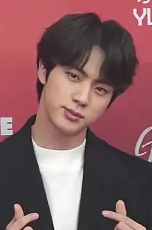 Jin was scouted by Big Hit Entertainment for his looks while walking down the street[8]—he was studying acting at the time and had no background in music[9]—and subsequently auditioned as an actor for the company before becoming an idol trainee.[10] On June 13, 2013, he made his debut as one of the four vocalists in BTS.[11] Under the band's name, Jin has performed three solo songs: "Awake", "Epiphany", and "Moon". "Awake", which he co-produced, was released in 2016, as part of BTS' second Korean studio album Wings.[9] The song peaked at number 31 on the Gaon Digital Chart and number six on the Billboard World Digital Song Sales chart in the United States.[12][13] He shared a Christmas version of "Awake" for free on SoundCloud that December.[14]