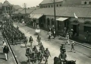 As the NRA launched a pincer attack on Jinan, the railways to Qingdao and Beijing were damaged, preventing warlord-aligned troops from receiving reinforcements.[14] This also brought the NRA in conflict with the Japanese, who were guarding the Qingdao–Jinan railway, though no violence broke out at this stage. On 29 April, chaos erupted as the warlord troops began to flee northwards across the Luokou Yellow River Railway Bridge, abandoning Jinan. As they left the city, the warlord forces were reported to have engaged in looting, though Japanese-inhabited areas continued to be protected by Japanese troops.[3] Public dissatisfaction with the presence of the Imperial Japanese Army in Shandong became increasingly evident, their presence viewed as a new attempt by the Japanese to seize control of the region, as they had in 1914 during the First World War. NRA troops marched into Jinan over the course of 30 April and 1 May, and took control without trouble.[3] On 2 May, Chiang Kai-shek began negotiations with the Japanese to withdraw their troops, gave assurances to Japanese Major General Ryū Saitō that there would be no disruption in Jinan, and ordered his troops to proceed northward from Jinan with haste, so as to avoid any potential conflict.[18][2][19] Following the negotiations, Saitō decided to begin preparations to withdraw the Japanese troops, and said that all security matters in Jinan would then be entrusted to Chiang. General Fukuda later gave his approval to this decision, and the Japanese troops began withdrawal during the night of 2–3 May.[18][20]