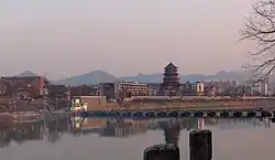 The town was established during the Jin dynasty under the name Changnan (昌南),[2] due to its location on the south bank of the Chang river.[4] The town's name would be changed twice, first in 742 CE to Fuliang (浮梁), and then in 1004 to Jingdezhen, its current name,[2] after the era name of the Emperor Zhenzong of Song during whose reign its porcelain production first rose to fame.[5] The town was placed under the jurisdiction of Fuliang County.[2]