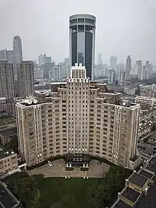 Shanghai Jinjiang Hotel (a.k.a. Jin Jiang Hotel) is a luxury hotel in Shanghai. The main part of the hotel comprises two early 20th century apartment buildings, set around two lawns. The hotel contains 515 guest rooms, which include both modern facilities and traditional furniture and decor. The hotel covers an area of about 30,000 square metres, of which 10,000 square metres are covered with green leisure space, flowers, and trees.[1]
