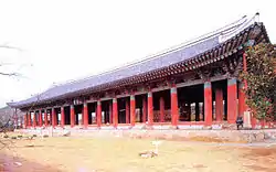 Jinnamgwan Hall (Korean: 진남관) is a historical building in the South Korean city Yeosu. The wooden structure consists of a roof, that is supported by 68 columns.[1] It is decorated with carved lotus buds, dragon heads, and Dancheong paintwork.[1][3] Jinnamgwan Hall is 75 m (246 ft) long and 14 m (46 ft) tall.[1]