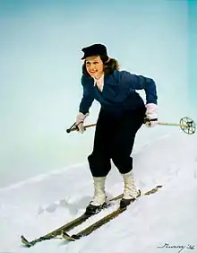 In 1937 her modeling career began when she met celebrity fashion photographer Paul Hesse,[4] whose Sunset Strip studio was a gathering place for advertising moguls and motion picture industry celebrities. Calling her "the most charming, most vital personality I have ever had the pleasure to photograph",[3] he took her picture for the August 1937 cover of The American Magazine, triggering similar offers from 60 other publications.[5] Falkenburg appeared on over 200 magazine covers and in some 1,500 commercial advertisements in the 1930s and 1940s.[6][7] She was considered to be one of the most beautiful women of that era, known for her All-American-Girl athletic good looks. The New Yorker magazine said she "possessed one of the most photogenic faces and frames in the Western world".[8] The New York World-Telegram said her face was seen more often and in more places than any other woman in the country.[3] And a headline story in the January 27, 1941, issue of Life magazine said Falkenburg "is the leading candidate for America's No. 1 Girl for 1941".