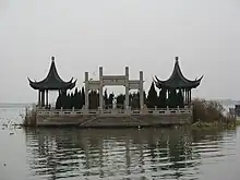 On the far side of the bridge lies the tomb of Concubine Chen,[2] from the Southern Song dynasty (1127-1279). It is built on a small piece of land in the center of the Wubao Lake, with trees encircling the cemetery and keeping company with the deceased.