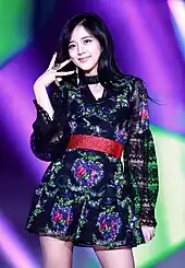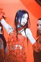 From 2017 to 2018, Jisoo joined Inkigayo as a host alongside Got7's Jin-young and NCT's Doyoung.[15] She first ventured into acting in 2019 with a short cameo appearance in the tvN fantasy drama Arthdal Chronicles as Song Joong-ki's love interest.[16] In June 2020, Jisoo's style in the teasers for Blackpink's single "How You Like That" went viral on social media. Celebrities and influencers in South Korea, China, Thailand, and Vietnam replicated her "two-bow hairstyle" and makeup, which Jisoo created herself.[17] Her "dot style", a makeup idea she originated, trended on social media platforms such as Instagram to promote the challenge among overseas fans.[18][19]