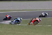 A further podium finish in Teruel and poor results from Quartararo, Viñales and Andrea Dovizioso saw Mir extend his championship advantage to 14 points over second-place Quartararo with three races remaining.[10] At the European Grand Prix, staged at the Circuit Ricardo Tormo near Valencia, Mir took his maiden win, beating his teammate Álex Rins, who finished in second place. With Quartararo falling early in the race and only able to salvage 2 points, Mir took a commanding 37-point lead over both his rivals with only 2 rounds remaining.[11][12] The following week at the Valencian Community Grand Prix at the same circuit, Mir finished in 7th place, while Rins managed only 4th and Quartararo crashed out, crowning Mir the 2020 MotoGP riders' champion.[13] He became the first Suzuki rider to win the title since Kenny Roberts Jr. in 2000, the first non-Honda or non-Yamaha rider to win the title since Ducati rider Casey Stoner in 2007, as well as the first Moto3 world champion to win the premier class title.