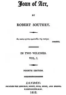 Regarding Joan of Arc, William Wordsworth wrote to William Matthews, 21 March 1796, claiming: "You were right about Southey, he is certainly a coxcomb, and has proved it completely by the preface to his Joan of Arc, an epic poem which he has just published. This preface is indeed a very conceited performance and the poem though in some passages of first-rate excellence is on the whole of very inferior execution."[13] Charles Lamb, in a 10 June 1796 letter to Coleridge, stated, "With Joan of Arc I have been delighted, amazed. I had not presumed to expect of any thing of such excellence from Southey. Why the poem is alone sufficient to redeem the character of the age we live in from the imputation of degenerating in Poetry [...] The subject is well chosen. It opens well [...] On the whole, I expect Southey one day to rival Milton."[14] (A few days later, though, in a June 13, 1796 letter to Coleridge, after reading his opinion of the work, Lamb tempered his praise: "Perhaps I had estimated Southey's merits too much by number, weight, and measure.")[15] Coleridge, in a 31 December 1796 letter to John Thelwall, admitted, "I entirely accord with your opinion of Southey's Joan [...] the poem tho' it frequently reach the sentimental, does not display, the poetical, Sublime. In language at once natural, perspicuous, & dignified, in manly pathos, in soothing & sonnet-like description, and above all, in character, & dramatic dialogue, Southey is unrivalled; but as certainly he does not possess opulence of Imagination, lofty-paced Harmony, or that toil of thinking, which is necessary in order to plan a Whole."[16]