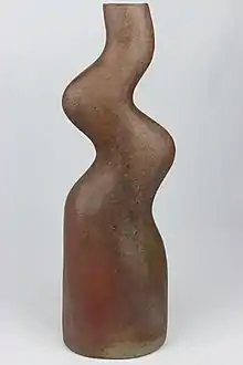 In the early 1950s Constantinidis exhibited somewhat traditional examples of pottery, inspired by industrial wares and Staffordshire slipware, with the Red Rose Guild and the British Crafts Centre but in the late 1950s, influenced by the works of Lucie Rie and Hans Coper changed her style.[2] Working at a studio she set up at Great Baddow she produced simpler designs with reduced decoration based around a few elemental shapes.[1] She developed painstaking methods to produce work that emphasized purity and harmony of both shape and decoration.[6] In the 1970s her pottery became sculptural and her pots were often greatly reworked by cutting and folding after being created on her potters' wheel.[2]