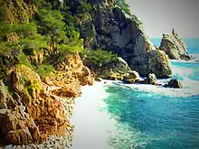 Nowadays Ruyra's memory is fondly remembered in his hometown Blanes, where the Town Hall promotes a multilingual literary route that explores different sites that inspired and feature in his short stories, such as the shipyards, the cove of Sa Forcanera or the Sanctuary of El Vilar.[3] In addition, a promenade and a local public school are named after him. In 1958, on the occasion of the centenary of Ruyra's birth, a homage monument was erected in the seafront, and in 1989 a plaque was placed in his family home –known as Can Creus, located on the Main Street– that reads as follows: "Joaquim Ruyra i Oms, devoted son of Blanes and master of Catalan prose".[8] The house where he lived in Arenys de Mar also has a plaque of ceramic in the façade.