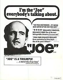 Quentin Tarantino wrote in his book Cinema Speculation that Joe is "a kettle-black comedy about class in America, bordering on satire", and said that although contemporary viewers may find it controversial to call the film a black comedy, he recalled that the audience he saw the film with in 1970, in a double feature with Carl Reiner's Where's Poppa?, watched the first section of Joe in silence, only to begin laughing "once Dennis Patrick enters the tavern, and Peter Boyle's Joe enters the movie", having gone from "repulsed repose to outright hilarity". Tarantino says that "Boyle's comedic performance alleviates the picture's one-note ugliness".[10] Variety wrote, "It sounds like heavy stuff, but scripter Norman Wexler has fleshed his serious skeleton with both melodrama plotting that sustains interest and the grittiest, most obscene dialog yet to boom from the silver screen. It works."[11] Howard Thompson of The New York Times wrote, "The sad, disappointing thing about 'Joe' is that a devastating, original idea cynically slopes into a melodramatic, surface fiasco."[12] Gene Siskel of the Chicago Tribune gave the film three-and-a-half stars out of four and called it "a landmark film because of the issues and social norms it justifies. It is a dramatic, if not always sophisticated, documentary of a growing portion of the national mentality."[13] Charles Champlin of the Los Angeles Times called it "an immensely sophisticated piece of film-making," adding, "The plot is laced with implausibilities and the movie full of scenes which are heavily contrived but which play well because they are swept along by the plausibility of Joe himself."[14] Gary Arnold of The Washington Post called it "a fascinating, tendentious picture—a topical murder melodrama and social parable, done in that vivid, loaded, paranoid style which seems to have become a tradition in record time but which remains exciting to watch, even if you question the drift and outcome of the parable."[15] Penelope Gilliatt of The New Yorker wrote, "In the end, 'Joe' sells us short. It shows us clashing archetypes, promises us something of large mind, and then stammers platitudes that lead theatrically every which way."[16]