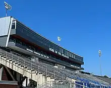 The press box and suites are located above the bleachers on the home side of Joe Aillet Stadium. Originally built in 1968 and expanded in 1988, the sky box was renovated and replaced in time for the 2017 season. The first floor of the facility includes multiple luxury suites for fans; and the second floor includes room for coaches, broadcast members, and gameday officials.[5] Additional signage was added onto the front, in time for the 2023 season, which highlighted the program's 3 national championships and 3 retired jersey numbers.