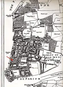 The parish contained 9 or 10 scattered hamlets, known as the Tower hamlets (because, originally, they had had a feudal obligation to supply men to guard the Tower of London).[58] From London, two ancient main roads ran across the parish: