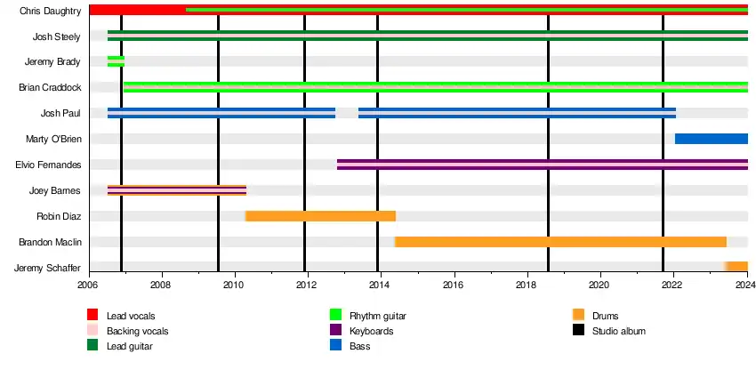 Chris Daughtry, who finished in fourth place on the fifth season of American Idol in 2006, stated that he would form a new band after turning down Fuel's offer to make him their lead singer.[6] On July 10, 2006, Chris Daughtry had signed with RCA Records and 19 Recordings, which held contracts with fellow American Idol contestants such as Kelly Clarkson and Clay Aiken, and among others. Chris Daughtry is a singer-songwriter himself and has collaborated with several other songwriters, such as Live's Ed Kowalczyk, Seether's Shaun Morgan, Goo Goo Dolls's John Rzeznik, Fuel's Carl Bell, 3 Doors Down's Brad Arnold, Matchbox Twenty's Rob Thomas, SR-71's Mitch Allan,[7] Shinedown's Brent Smith, Three Days Grace's Adam Gontier, and the former The Click Five singer Eric Dill, Theory of a Deadman's Tyler Connolly, Lifehouse's Jason Wade and Nickelback's Chad Kroeger.