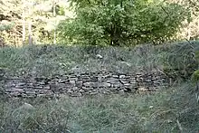 On the southern edge of the plateau, from the southern end of the western hillfort to the edge in the west, an approximately 35 m long, much lower hillfort has survived. A sketch from 1884 and a drawing from 1912 also show a hillfort at the transition from the trapezoidal plateau to the spur, where today only a clear terrain edge can be seen.[4] According to the older plan, the plateau was even surrounded by hillforts on all sides. Probably the low hillfort is the remainder of an edge fortification, which was preserved on the somewhat less rugged steep slope to the south here.