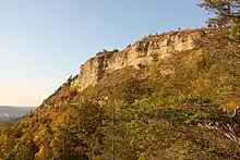 The Muschelkalk plateau of the Wöllmisse jumps out here with a boot-shaped spur far to the west. The Johannisberg with a height of 360–373 meters above sea level is limited in the north by the narrow Pennickental and in the south by the wide valley of the Roda. In the west it breaks off steeply, in the upper part almost vertically to the Saale Valley. The height difference is 215–220 m. It can be distinguished between a roughly trapezoidal plateau with 180 m of greatest length and 70 m of greatest width and the steeply sloping, ridge-shaped, northwest-facing peak with a length of about 200 m. To the east, the mountain, with an average width of 120 m, merges into the plateau of the Wöllmisse without any natural obstacle. There are two powerful springs in a small, deep water crack on the southern edge of the mountain, about 250 m south and 100 m below the plateau. North of the Johannisberg, the Pennickenbach flows in the valley about 140 m below.[3]