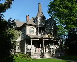 The house was built in 1897 for businessman John Robertson and his wife Martha. Robertson moved to Lodi from his hometown of Vienna, Wisconsin the same year; he had also spent several years in Nebraska as a land developer. Architect Frank L. Lindsay designed the Queen Anne style house. The two-and-a-half story house features a full-width front porch with a sunburst pediment over the entrance, an octagonal tower atop the front facade with a steep roof, wooden window surrounds topped by broken pediments, dentillated molding and frieze boards below the eaves, and a hip roof with cross gables.[2][3]
