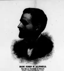 John Peter Altgeld (December 30, 1847 – March 12, 1902) was an American politician and the 20th Governor of Illinois, serving from 1893 until 1897. He was the first Democrat to govern that state since the 1850s. A leading figure of the Progressive movement, Altgeld signed workplace safety and child labor laws, pardoned three of the men convicted in the Haymarket Affair, and rejected calls in 1894 to break up the Pullman strike by force. In 1896 he was a leader of the progressive wing of the Democratic Party, opposing President Grover Cleveland and the conservative Bourbon Democrats. He was defeated for reelection in 1896 in an intensely fought, bitter campaign.