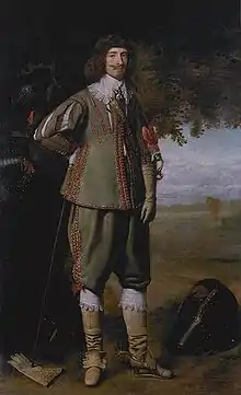 Subsequently, the Commonwealth authorities detained Ashburnham in the Tower of London and three times banished him to the Channel Islands.[2] Ashburnham was parted from his master Charles by order of the parliament, 1 January 1648, was imprisoned in Windsor Castle (May), and when the Second English Civil War broke out was exchanged for Sir William Masham. He was not allowed to attend the king during the Treaty of Newport (August), and was included among the delinquents who were to expect no pardon (13 October). He was constantly harassed. He had acquired an estate by his second marriage with the Dowager Lady Poulett (1649) (Widow of John Poulett, 1st Baron Poulett), and Charles II gave him permission to stay in England to preserve it. Royalists, however, suspected his fidelity, and (March 1650) in a memorial to the king asked whether they might trust him. He was sued for debts contracted for the late Charles I. He was forced to compound for one half of his estate, was bound in heavy securities to appear, when required, before the council of state, and his private journeys were licensed by a pass from the council. For three years he was asked by committees to discover who had lent the king money during the wars. His three banishments to Guernsey Castle were for sending money to the king.[1]