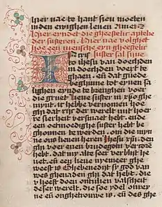 Excerpt from the manuscript "Devote tractaten in het Middelnederlands" of Johannes Brugman. Manufactured in Maaseik, 1476. Preserved in the University Library of Ghent.[1]