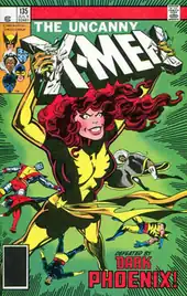 Byrne joined Claremont beginning with X-Men #108 (Dec. 1977), which was later renamed The Uncanny X-Men with issue #114.[25] Their work together, along with inker Terry Austin, on such classic story arcs as "Proteus", "Dark Phoenix Saga", and "Days of Future Past" would make them both fan favorites.[26] Byrne insisted that the title keep its Canadian character, Wolverine, and contributed a series of story elements to justify Wolverine's presence which eventually made the character among the most popular in Marvel's publishing history. With issue #114, Byrne began co-plotting the series as well as penciling. Claremont recounted that "at that point in time John and I were, in a very real sense, true collaborators on the book. It was with very few exceptions, difficult, for me, anyway, to tell in the actual gestation of the book where one of us left off and the other began – because it involved one of us coming up with an idea and bouncing it off the other ..."[27] The "Dark Phoenix Saga" in 1980 is one of the most notable stories in the title's history.[28][29] Comics writers and historians Roy Thomas and Peter Sanderson observed that "'The Dark Phoenix Saga' is to Claremont and Byrne what the 'Galactus Trilogy' is to Stan Lee and Jack Kirby. It is a landmark in Marvel history, showcasing its creators' work at the height of their abilities."[30] Byrne has repeatedly compared his working relationship with Claremont to Gilbert and Sullivan, and has said that they were "almost constantly at war over who the characters were."[31] Byrne created the characters Alpha Flight,[32] Proteus,[33] and Kitty Pryde/Shadowcat[34][35] during his run on The X-Men. A new Brotherhood of Evil Mutants, led by Mystique, was introduced in the "Days of Future Past" storyline (#141–142, Jan.-Feb. 1981) in which a time-travelling Kitty Pryde tried to avert a dystopian future caused by the Brotherhood assassinating Presidential candidate Senator Robert Kelly.[36] Byrne plotted the story wanting to depict the Sentinels as a genuine threat to the existence of the mutant race.[37] Byrne left The X-Men with #143 (March 1981). During his tenure on the series, The X-Men was promoted from a bimonthly to a monthly publication schedule as sales steadily increased—a trend that continued long after Byrne left.[38]