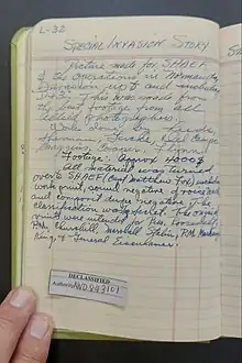 Meanwhile, some of the Ford-supervised color footage of the Normandy landings was converted to black and white for use in newsreels released by Movietone and Pathé.[4][9] It also appeared in government documentaries including United States Coast Guard Report Number 4: Normandy Invasion.[6] Ford's most effective contribution to the documentary record of D-Day was apparently his notion to install camera mounts and automated cameras to the front of vehicles, tanks and landing craft. According to Searching for John Ford, there were 500 Eyemo cameras, each loaded with four minutes of 35 mm movie film.[6] According to a Navy citation commending Ford, 152 landing craft had fixed cameras, set to begin filming after the third man or third craft left the boat.[3] Per a Brigadier W.A.S. Turner memo of 25 July 1944, the "excellent photographic coverage" obtained from the automated cameras was largely due to the "conversion, testing, installation, and operation" of the cameras by Lt. M. E. Armistead of the Field Photographic Branch.[3]