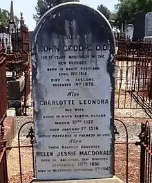 Rev. Geddie's wife, Charlotte Macdonald born 1822, was the daughter of Charlotte Leonora Harrington and Dr. Alexander Macdonald of Antigonish, Nova Scotia. After the death of her husband she lived in Melbourne where she had the company of her daughter Helen, and where she died in 1916.[32][33]