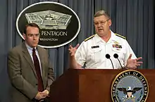 Young (left) and Rear Admiral John Butler at the announcement of plans for the United States Navy to acquire six Virginia class submarines, August 2003.