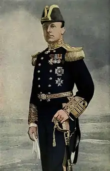 Jellicoe was appointed second-in-command of the Atlantic Fleet in August 1907, hoisting his flag in the battleship HMS Albemarle.[16] He was appointed Knight Commander of the Royal Victorian Order on the occasion of the King's Review of the Home Fleet in the Solent on 3 August 1907.[19] He went on to be Third Sea Lord and Controller of the Navy in October 1908 and, having taken part in the funeral of King Edward VII in May 1910,[20] he became Commander-in-Chief, Atlantic Fleet in December 1910, hoisting his flag in the battleship HMS Prince of Wales.[16] He advanced to Knight Commander of the Order of the Bath on the Coronation of King George V on 19 June 1911 and confirmed in the rank of vice admiral on 18 September 1911.[16] He went on to be Second-in-Command of the Home Fleet, hoisting his flag in the battleship HMS Hercules, in December 1911 and, having also been appointed commander of the 2nd Battle Squadron in May 1912, joined the Royal Commission on Fuel and Engines on 1 August 1912.[21] He became Second Sea Lord in December 1912.[16]