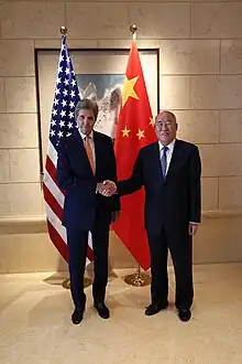In January 2013, Kerry was nominated by Obama to succeed Secretary of State Hillary Clinton, and was confirmed by his Senate colleagues on a vote of 94 to 3.[1] He was U.S. secretary of state throughout the second term of the Obama administration from 2013 to 2017. During his tenure, he initiated the 2013–2014 Israeli–Palestinian peace talks and negotiated agreements restricting the nuclear program of Iran, including the 2013 Joint Plan of Action and the 2015 Joint Comprehensive Plan of Action. In 2015, Kerry signed the Paris Agreement on climate change on behalf of the United States.