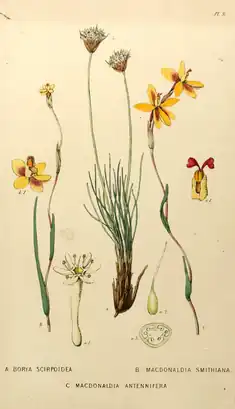 Lindley described the plants collected on Thomas Livingstone Mitchell's expeditions of 1838 and wrote an Appendix to Edwards's Botanical Register of 1839, describing plants collected by James Drummond and Georgiana Molloy of the Swan River Colony in Western Australia.[7] According to John Ryan, Lindley's 1840 ‘Sketch of the Vegetation of the Swan River Colony’ provided ‘the most succinct portrait to date of the flora of the Swan River Settlement’, which had been established in 1829.[8] The Sketch, which was published during November 1839 and January 1840 in Edwards’ Botanical Register and separately on its completion, was illustrated by nine hand-coloured lithographs and four wood-cuts.[8] He also played a large part in having Charles Moore appointed as Director of the Sydney Botanical Gardens.