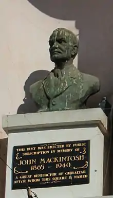 A bust and plaque memorial to his name was unveiled on the western façade of the House of Assembly (now the Gibraltar Parliament) building facing the square in April, 1974.[3] Mackintosh was posthumously awarded the Gibraltar Medallion of Honour by Parliament for his services to philanthropy and officially announced by Mayor of Gibraltar, Solomon Levy, on National Day 2008.[4]