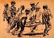 "In the Marines, as a combat artist, I traveled with the troops and for three years got all the drawing opportunity anyone could want. My work changed enormously during this time and I’m sure it was due to constant drawing, every single day, from life, just putting down what I saw around me. In a few instances it was a dangerous kind of scholarship."[7]