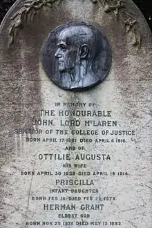 Lord McLaren died in Brighton in Sussex on 6 April 1910 but was returned to Edinburgh for burial in the Grange Cemetery on its southernmost path.[3] The original bronze medallion head was stolen but it is replaced with an accurate and convincing plastic replica.