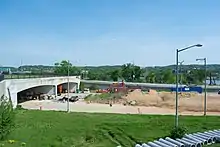 In 2009, the District of Columbia Department of Transportation (DDOT) began the replacement of the 11th Street Bridges just down the Anacostia River. It closed and decommissioned the segment of Interstate 695 from the 11th Street Bridges to Barney Circle by early 2013.[128][137][138] These changes removed a significant portion of the traffic using Sousa Bridge, from 50,000 vehicles per day (each way) in 2004 to an estimated 35,000 vehicles per day (each way) in 2030.[139] DDOT also redesigned and rebuilt the ramp from Pennsylvania Avenue SE to northbound D.C. Route 295 to improve its safety.[124][140] Decommissioned Interstate 695 began to be transformed into a boulevard named "Southeast Boulevard",[127] a four-lane grand boulevard with a landscaped median and pedestrian nature trail designed to link Barney Circle to 11th Street SE.[127]