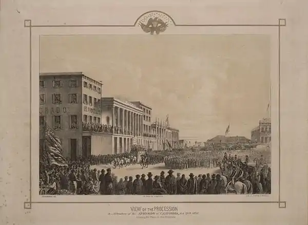 View of the Procession in Celebration of the Admission of California, Oct. 29, 1850, Crossing the Plaza of San Francisco, lithograph by John Prendergast
