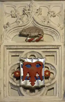 The Speke Chantry, called the "Chapel of St George" by its founder, is situated at the east end of the north choir aisle and forms a pair with the chantry of Bishop of Exeter Hugh Oldham (c. 1452 – 1519) at the east end of the south choir aisle. Both are protruded out to use space between two external buttresses of the building. Speke and the bishop were friends and the two chantries appear to have been planned by both men. The "owl" arms of Oldham appear on the outside wall of the Speke Chantry, with the arms of Henry Courtenay, 1st Marquess of Exeter, 2nd Earl of Devon (1498–1539),[37] with above the rarely seen Courtenay heraldic badge of Jupiter as an eagle holding a thunderbolt.[38] The first clause in his will was:[39]