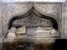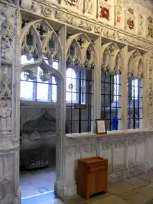 The recumbent effigy of Sir John Speke, dressed in full armour, lies within a canopied recess in the north wall. He is bare-headed with long wavy hair, his head resting on his helm. He wears two long chains around his neck and holds his hands together above his chest in prayer. The walls are highly decorated with relief sculpture in panels, with stone vaulted ceiling with pendants, "not an inch left unadorned".[42] The decorations include much heraldry and several instances of the canting heraldic device of the Speke family, the porcupine, in French porc-épic, ("spiky-pig").